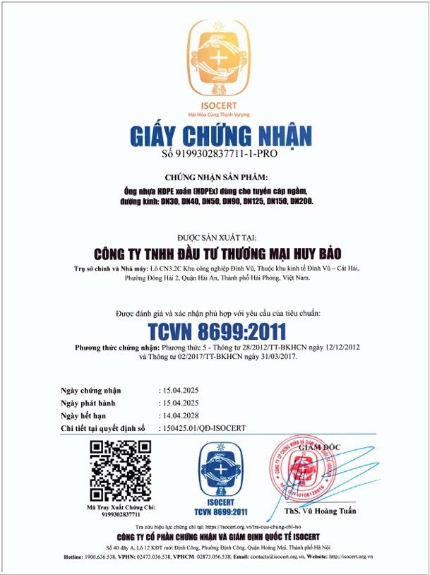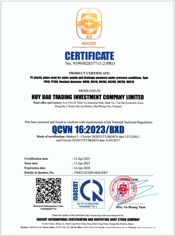 Sản phẩm của Huy Bảo được ứng dụng rộng rãi trong nhiều lĩnh vực như thoát nước đô thị, thoát nước nông nghiệp, xây dựng công trình, xử lý nước thải hóa chất, đường sắt, đường cao tốc và các dự án hạ tầng kỹ thuật khác. Với nền tảng công nghệ sản xuất tiên tiến, hệ thống quản lý khoa học, cùng cam kết chất lượng sản phẩm vượt trội và dịch vụ hậu mãi tận tâm, Huy Bảo luôn đề cao uy tín, tiến độ và hiệu quả trong từng hợp đồng. Công ty không ngừng đổi mới để mang đến những giải pháp ống nhựa tối ưu, góp phần tạo ra giá trị bền vững cho khách hàng và cộng đồng.
